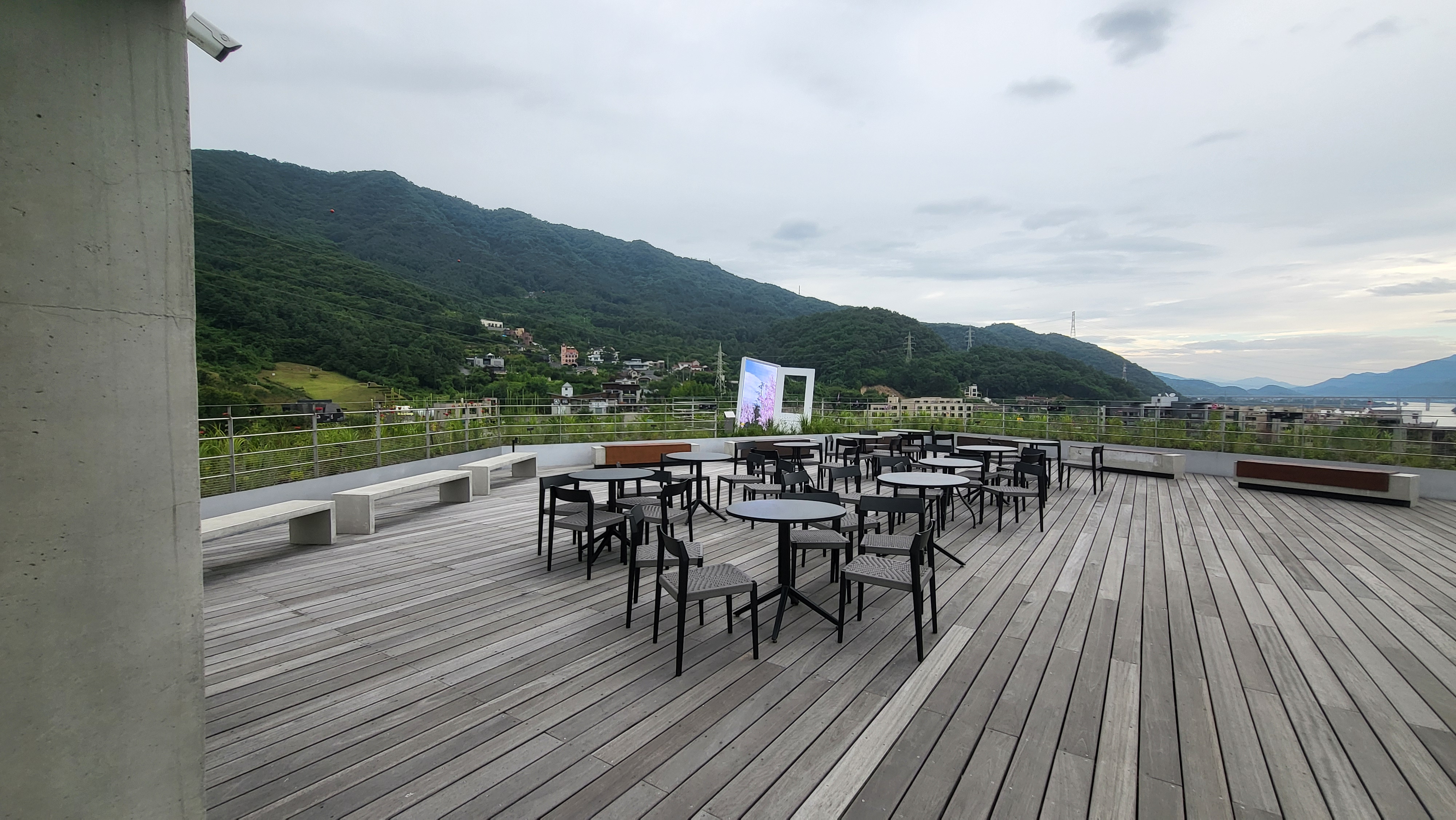 2층, 3층은 애견동반 금지고 엘리베이터는 3층까지만 연결되고 옥상은 3층에서 계단으로 걸어 올라가 야하니 펫존은 1층뿐인 것 같아요~ 그래도 북한강까지 왔는데 그냥 가기 아쉬워서 옥상에 올라가 보니 탁 트인 전망이 너무 좋더라고요~~ 꼭 올라가 보세요~^^ 하지만 파라솔이 없다는 단점이 ㅜㅜ 봄, 가을에 이용해보겠습니다.