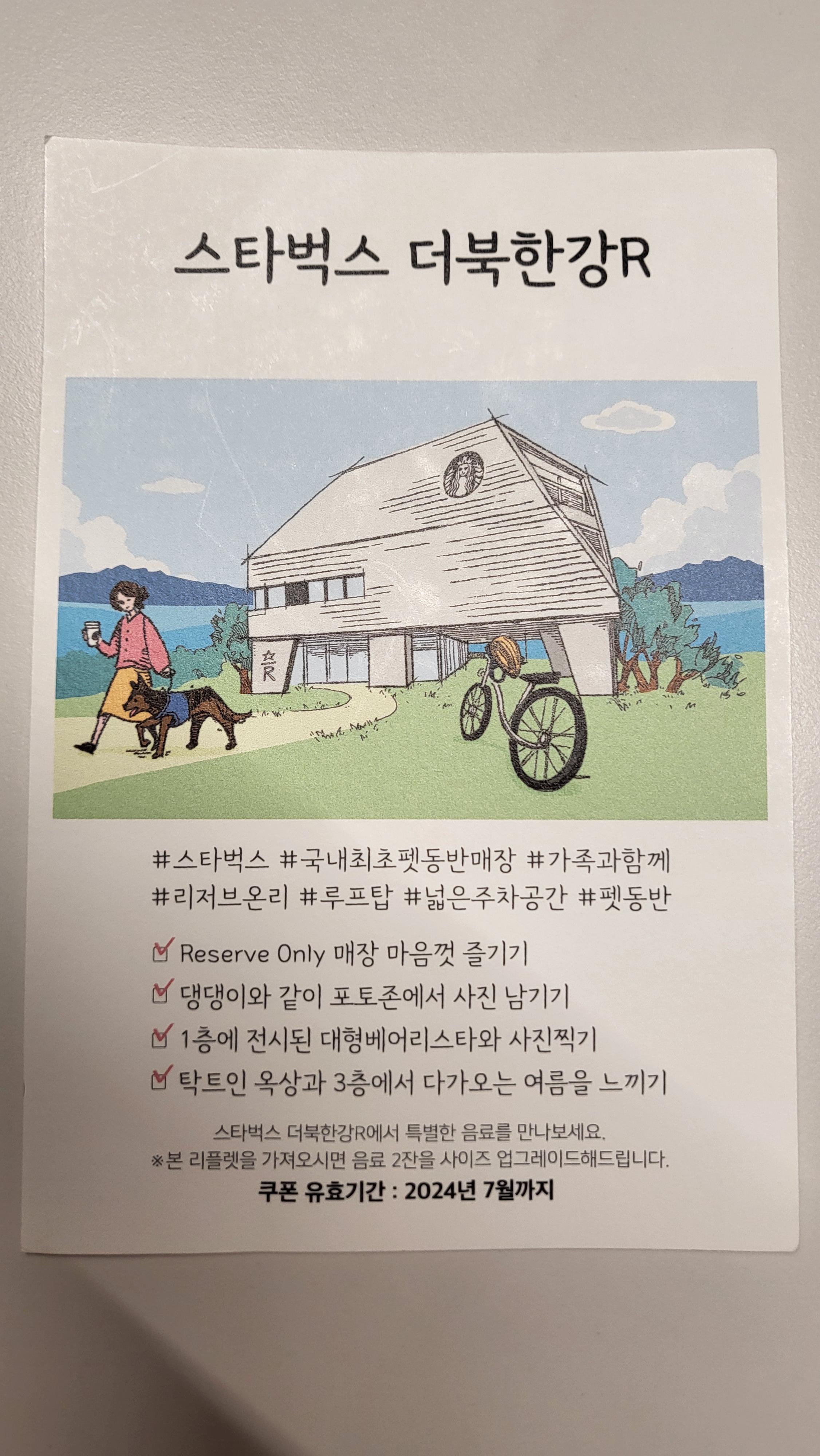 저는 작년 2023년에 스타벅스 더북한강 R점을 처음 방문했었는데 그때도 펫존이 있었던 매장이었어요. 그런데 최근에 좀 더 펫프렌들리 하게 변신했다고 들은 것 같아서 주변에 갔다가 들려봤습니다.