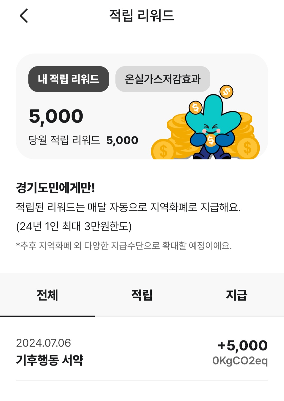 리워드는 지역화폐로 지급되는데 1년에 6만원 한도. 지금은 7월이라서 24년 끝날때까지 3만원 적립가능합니다.