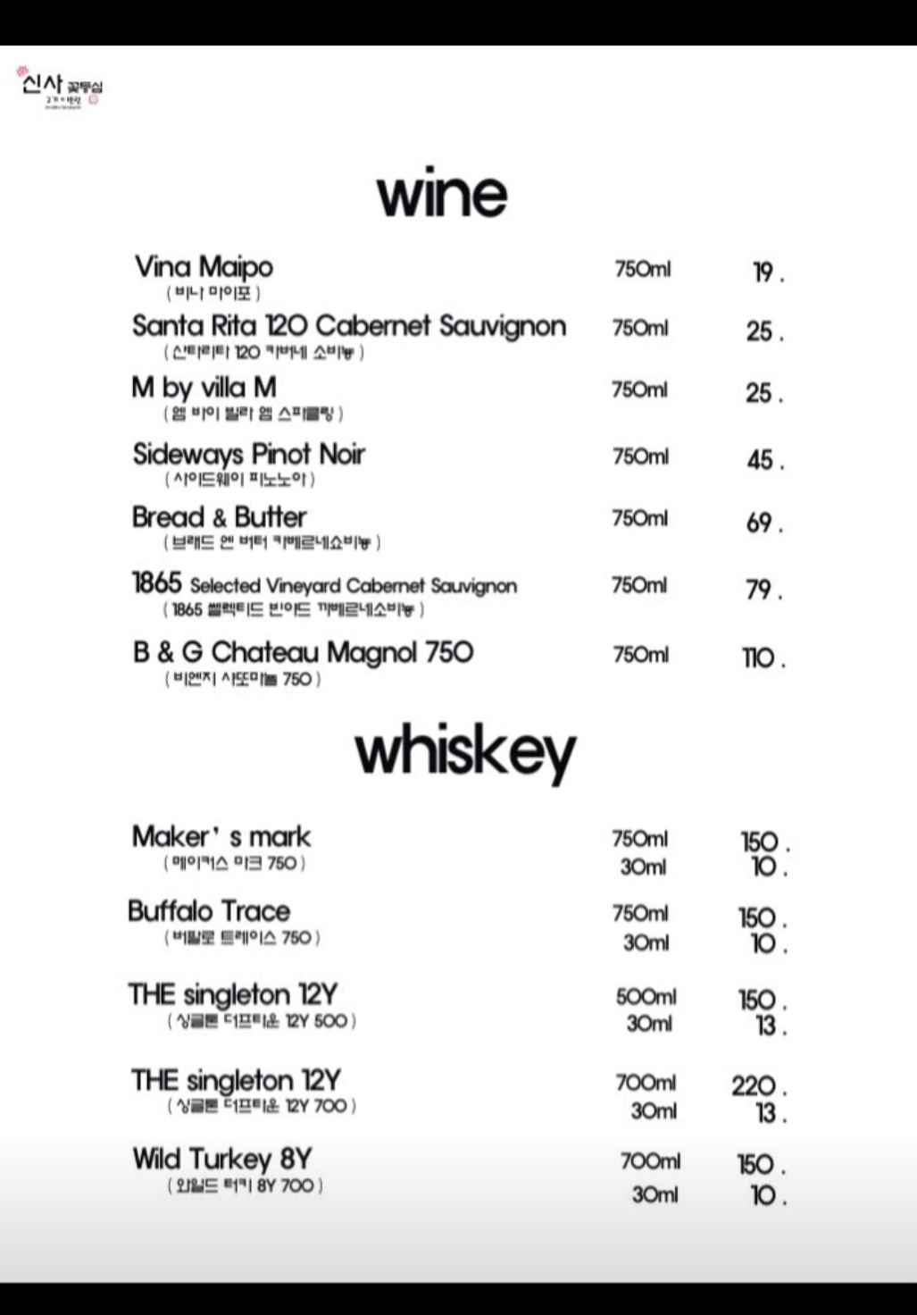특별한 날이라면 아래와 같이 와인과 위스키를 주문해서 같이 결들여도 좋을듯하다.